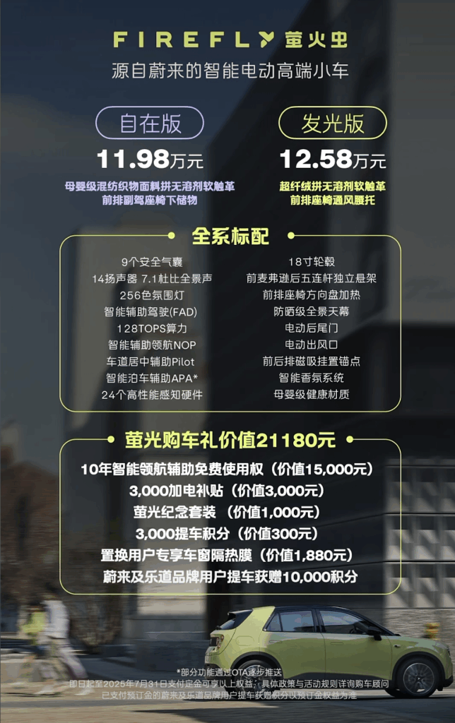 而今晚,这款精品纯电小车正式上市,共推出两个版本,分别为11.98万元的自在版与12.58万元的发光版, BaaS车电分离方案将于8月推出。