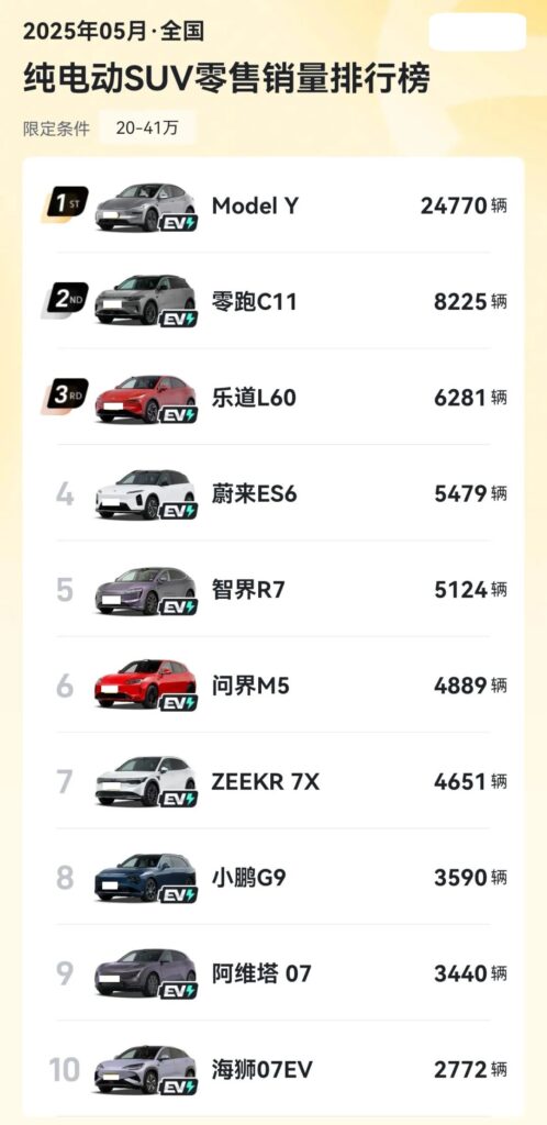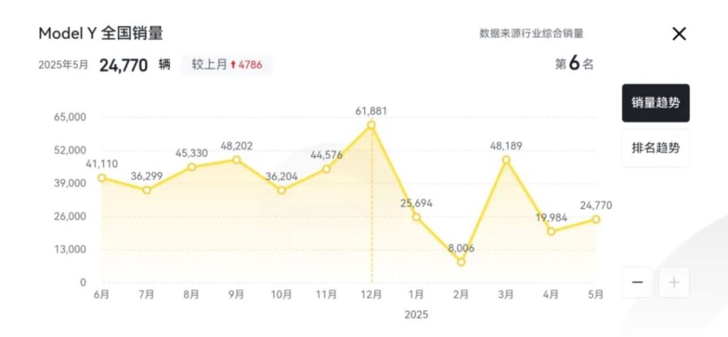 前5个月,Model Y在华零售销量分别为25,694辆、8,006辆、48,189辆、19,984辆、24,770辆,均出现了大幅度的同比下滑。