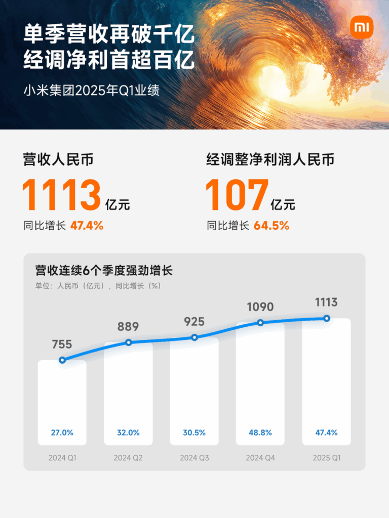 财报显示,2025年Q1小米营收同比增长47.4%至1113亿元,继2024年Q4后再破千亿;经调整净利润首次突破百亿,达到107亿元,同比增幅高达64.5%。