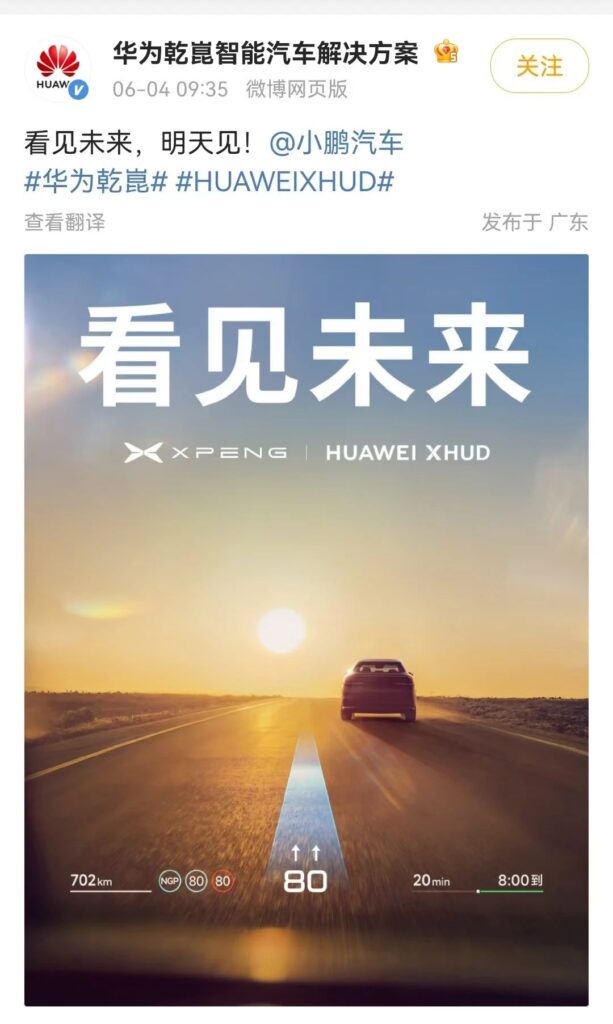 根据海报显示的抬头显示器HUD界面,也有猜想小鹏将搭载华为车BU的HUD。实际上,新G7就采用了华为XHUD。