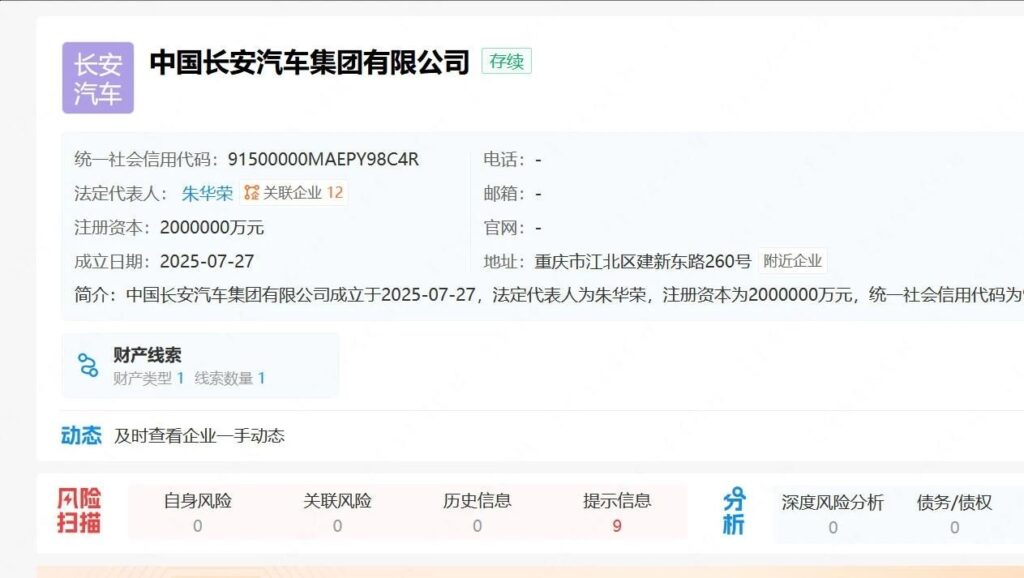 企查查信息显示,中国长安汽车集团有限公司成立于2025年7月27日,注册资本200亿,法定代表人为朱华荣。据悉,这也是第一个落地重庆的央企。