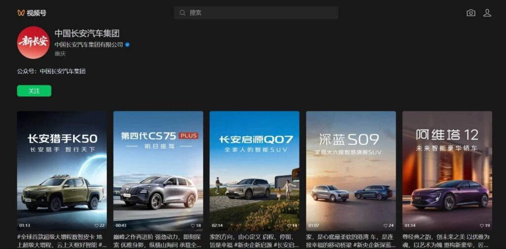 不过,中国长安汽车集团的微信视频号已经发布7条视频,视频内容为长安汽车、辰致集团宣传片,以及阿维塔、深蓝汽车、长安启源、长安汽车、长安凯程5大品牌的明星车型视频。