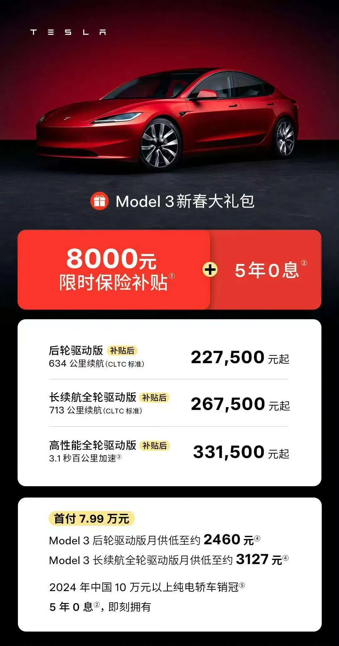 先是突袭发布万众期待的焕新版Model Y,又在春节假期刚刚结束第一天,在华官宣针对焕新版Model 3全系车型,推出限时赠送保险且可叠加五年免息。