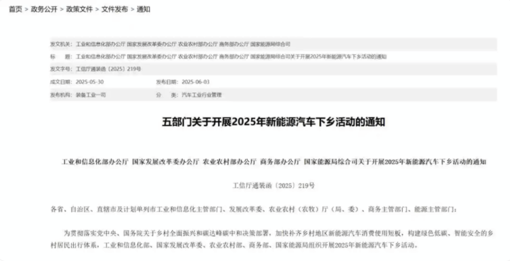 6月3日,工信部等五部门联合发布关于开展2025年新能源汽车下乡活动的通知。通知显示,为加快补齐乡村地区新能源汽车消费使用短板,构建绿色低碳、智能安全的乡村居民出行体系,工和信部等组织开展2025年新能源汽车下乡活动。