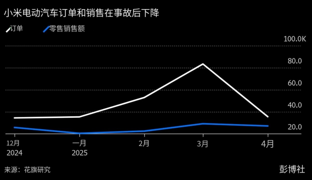 据外媒报道,自今年年初以来,小米SU7的订单从2月的5.3万辆增长到3月的8.34万辆后,累计订单开始增速缓慢。尤其是3月底高速事故发生后,小米汽车销量急剧下降,零售销量从3月的2.92万辆下降到一个月后的2.72万辆。