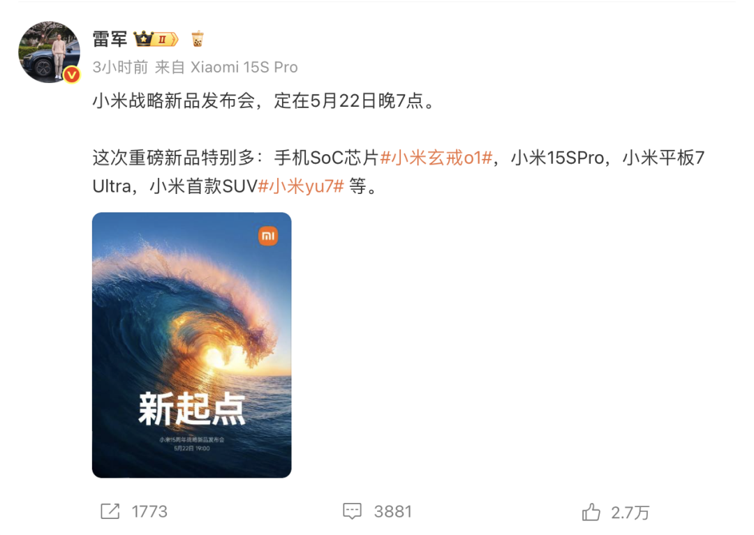 5月19日上午,雷军在个人微博上宣布小米YU7定档三天后的5月22日发布,无论是提供额外的销量支撑还是“冲喜”为企业渡过近期的舆论风波走出“最艰难的时刻”,这款即将冲入主流新能源SUV赛道的车型,对小米汽车而言都至关重要。