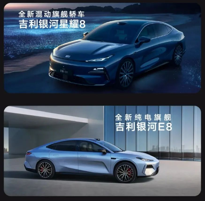 当然战略和技术的背后,需要产品去做支撑和呈现,发布会上另一个比较重要的板块就是新产品了。新款吉利银河E8产品力作出了全面的升级,售价下调至14.98万元起;同时亮相了吉利全新混动旗舰轿车吉利银河星耀8 EM,与银河E8组成了银河新能源旗舰双子星。