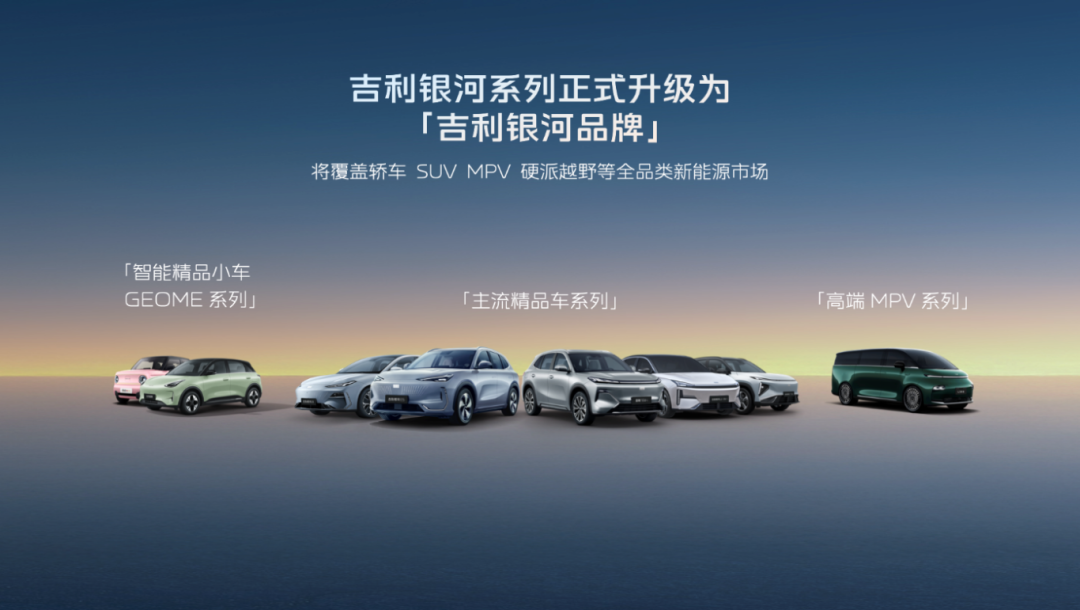 加上之前并入的几何和雷达,诞生2年的吉利银河,由此从序列独立升级为品牌,覆盖轿车、SUV、MPV、硬派越野等全品类新能源市场,全力迈向年销百万的新时代,致力于成为新能源精品车的引领者。