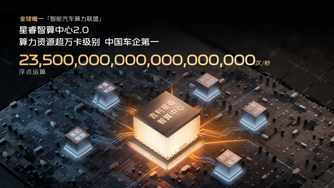 一方面是吉利的星睿智算中心,另一方面则是联合了阶跃星辰、千里科技等科技生态伙伴,共同组建了智能汽车算力联盟。算力资源达到万卡级别,综合算力提升到23.5EFLOPS,位居中国车企算力第一。