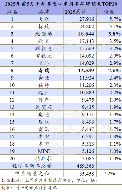 同时,我国出口到土耳其的汽车数量虽远不及阿联酋和沙特,但前5个月比亚迪和奇瑞在该市场的销量分别达到18,644辆和12,539辆,在48.9万辆的轻型车新车总量占比分别为3.8%和2.6%。同时,JAECOO和MG也分别售出2,878辆和1,123辆,还有少量的赛力斯、创维、零跑和红旗,仅这些品牌的市场率之和就有7.2%。