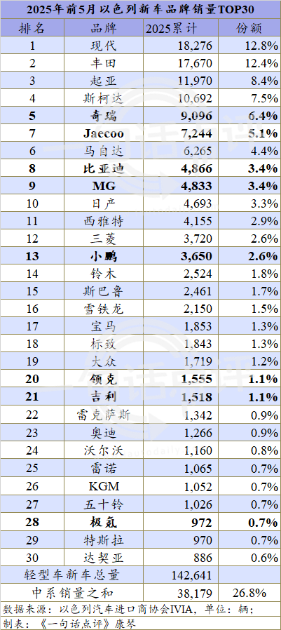 今年前5个月以色列新车销量同比增长10.4%至14.3万辆,27个自主品牌共售出3.8万辆,市场份额为26.8%。其中,奇瑞、JAECOO、比亚迪和MG分别以9,096辆、7,244辆、4,866辆和4,833辆排名第5、第6、第8和第9。小鹏、领克和吉利也分别售出3,650辆、1,555辆和1,518辆。此外,极氪、东风、赛力斯、零跑和大通等也有数百辆的销量。