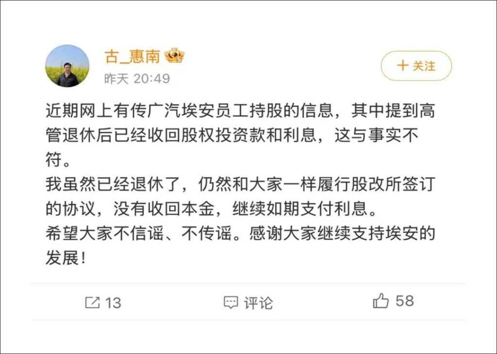 同时,刚刚退休不久的古惠南同样在社交平台上,给出了自己的立场。身为带领广汽埃安从广汽新能源时代一路踏入中国新能源车企第一梯队的核心领导者,前广汽埃安总经理古惠南声称,其在退休后仍在履行股改所签订的协议,难道还不能将流言终结吗?