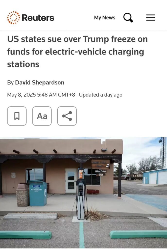 这份联合诉讼,让特朗普措手不及。白宫的官方回应还没出炉,事隔两天,17个州和华盛顿特区再次集中火力,向特朗普的电动车政策“开炮”——指控其叫停了一项联邦电动汽车充电桩资助计划,并非法扣押原本用于建设更多电动车充电桩的数十亿美元资金。