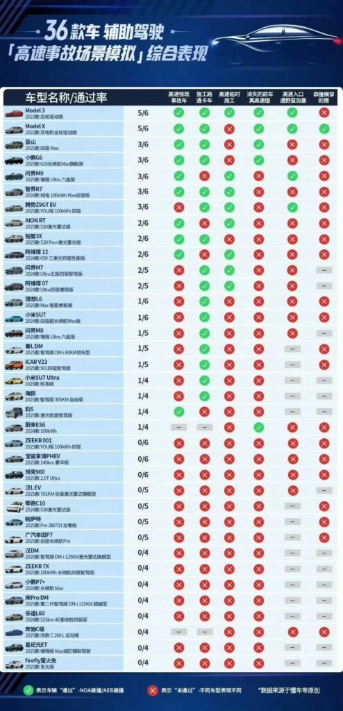 于是乎,36款主流车型化身“马路版鱿鱼游戏”选手–消失的前车、夜间的夺命卡车、突然窜出的“神兽”,一场硬核测试上演。但在数百次模拟碰撞后的模拟结果显示:高速夜间遇施工+卡车的场景中,仅47%的车辆能安全避让;儿童过马路项目的通过率是58%。