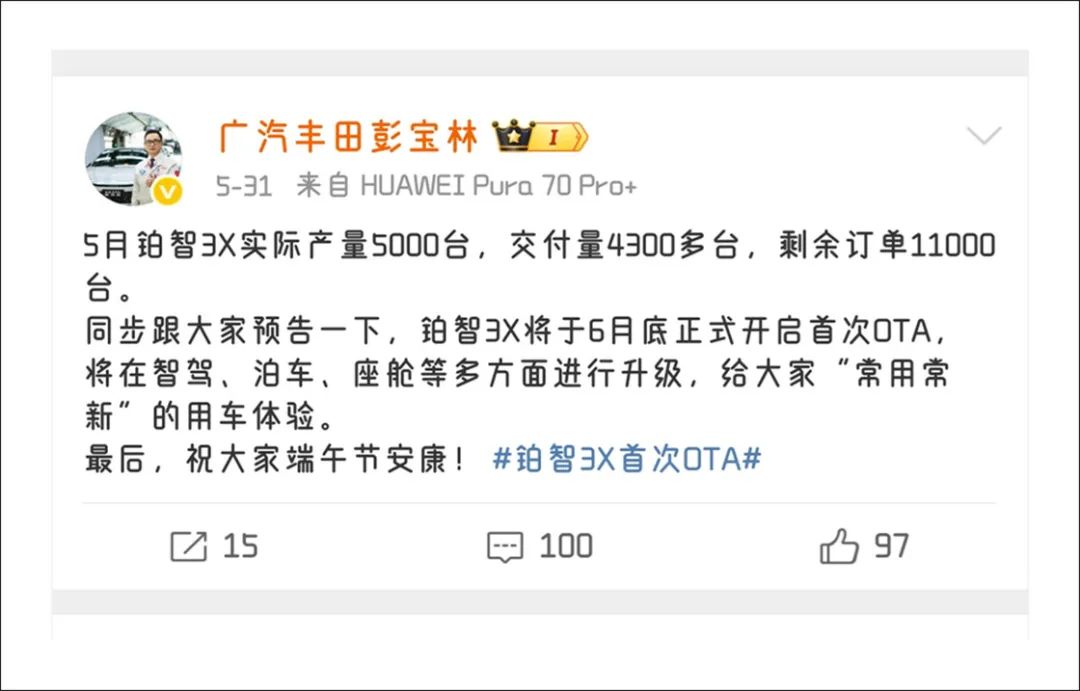 早在5月末,广汽丰田副总经理彭宝林就在社交平台上发文称,“5月铂智3X的实际产量为5000台,交付量为4300多台,剩余订单11000台。同时,铂智3X也将与6月底正式开启首次OTA,将在智驾、泊车、座舱等多方面进行升级。”