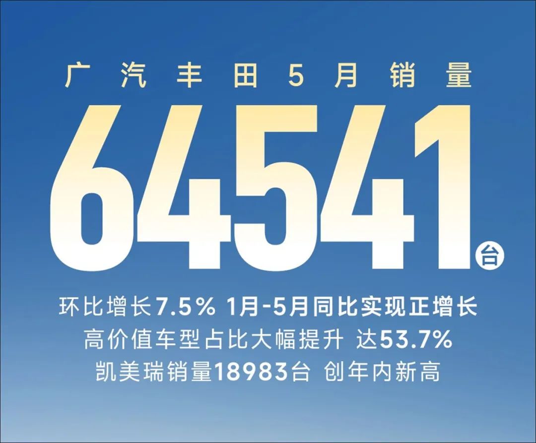 那到了今天,结合广汽丰田自己给出的销量数据可知,继4月取得月销60038辆的成绩,整个5月,其零售销量取得了环比7.5%的增长,达64541辆。得益于如此增势,和整个大环境相比,广汽丰田1~5月的累计销量果真得到了同步正增长。