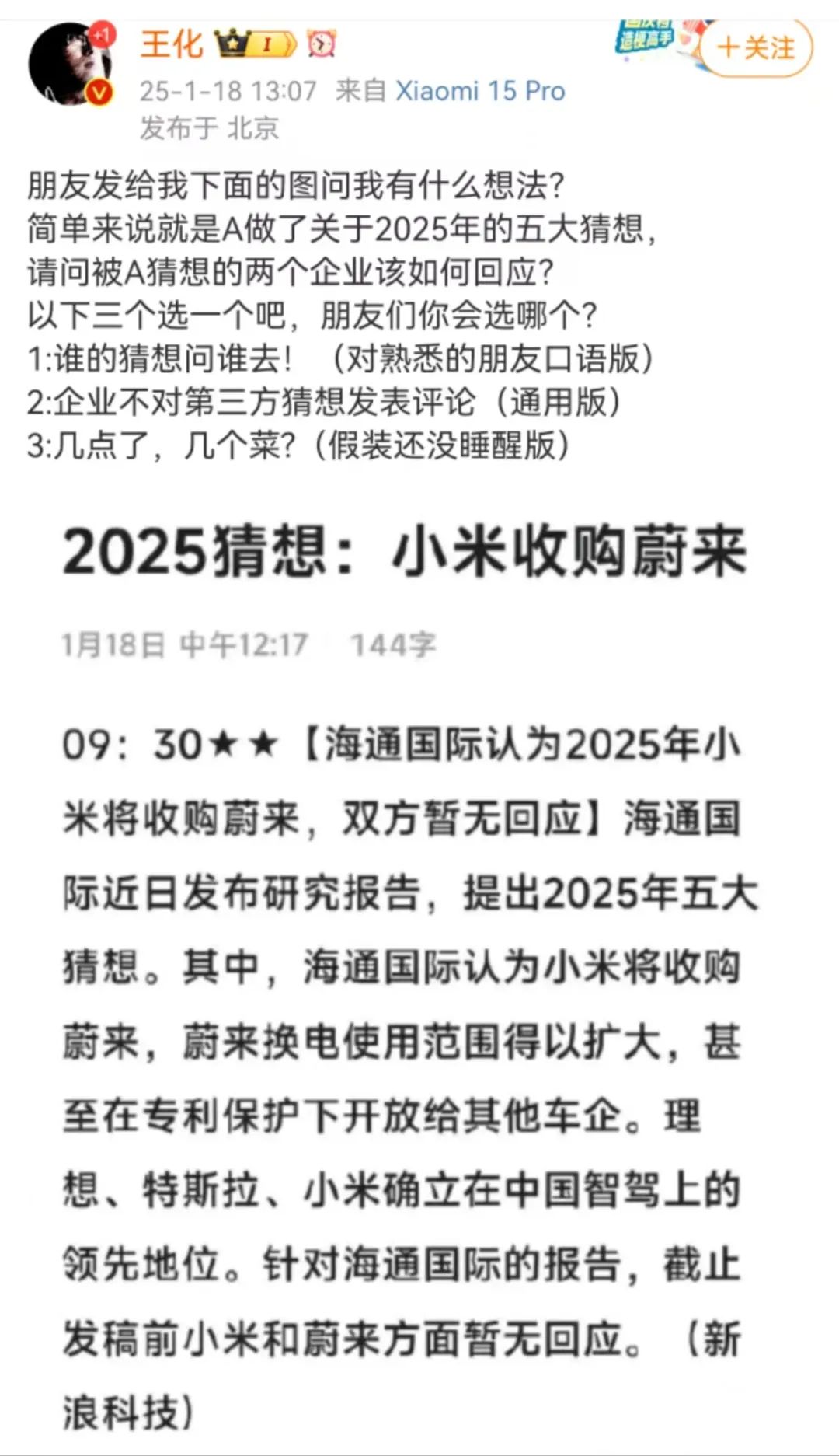 首先,便是不久前,海通国际发布的研究报告,位于行业内激起千层浪。内容中,大胆提出针对2025年的五大猜想,最后一条“小米将收购蔚来”的说法,更是直接登上各大平台热搜、引发热议。