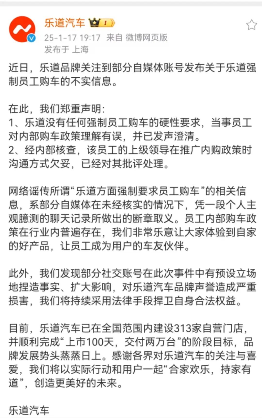 并且,还专门补充道:“我们发现部分社交账号在此次事件中有预设立场地捏造事实、扩大影响,对乐道品牌声誉造成严重损害,我们将持续采用法律手段捍卫自身合法权益。”