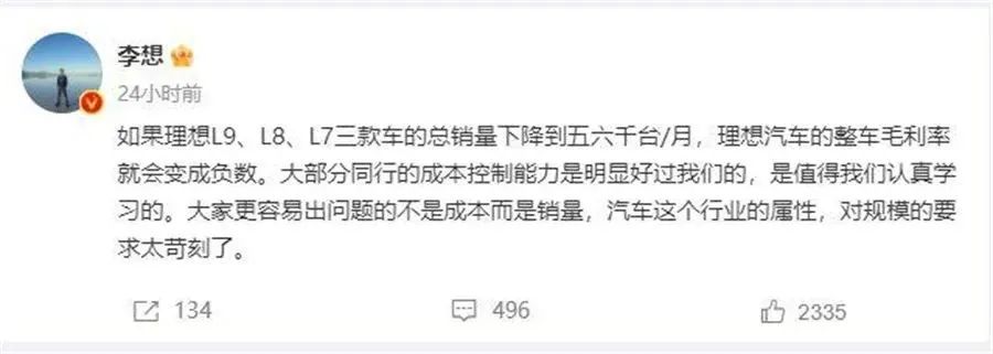 2023年5月,理想汽车CEO李想发文感慨:“汽车这个行业的属性,对规模的要求太苛刻了。”