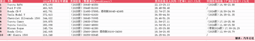 以美国2024年销量前十的车型为例,除却3款皮卡无法进行销量对比外,余下几款车型无一例外,均是美国售价更高。