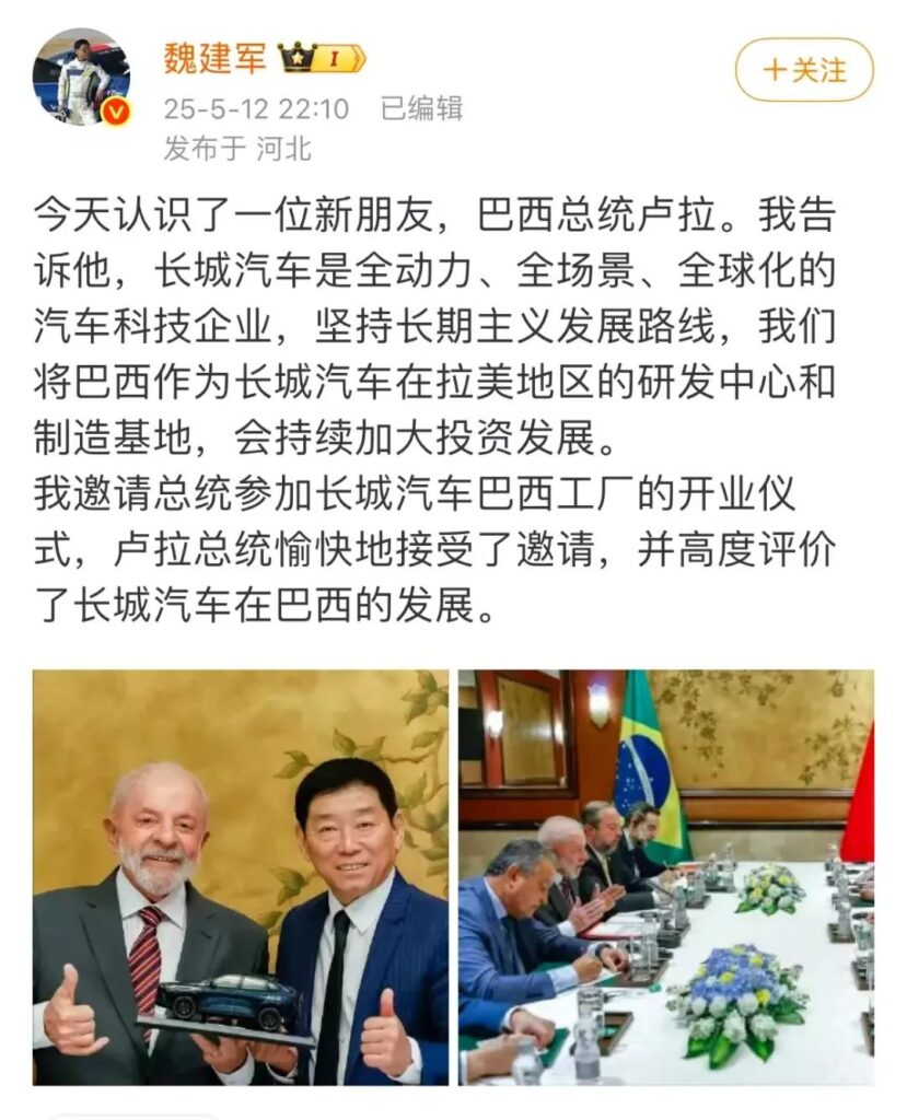 5月中旬,长城汽车董事长魏建军接连发布两条微博,讲述了陪同巴西总统卢拉试乘长城汽车的愉快经历,同时也为自己的汽车做了一波顶流广告。卢拉亲自试驾了魏牌高山MPV和哈弗H9,饶有兴致地坐上主驾和后座位置,还直言“希望这些车型尽快引入巴西” 。