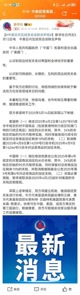 5月12日,中美两国发布联合声明,双方关税壁垒开始“松绑”。