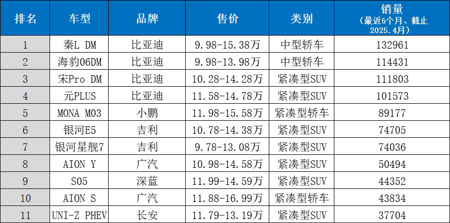 本文统计了从2024年11月到2025年4月之间的6个月中,售价在10-15万元之间的所有新能源车型销量,并从中摘取了前11名。从数据表现来看几个比较有意思的看点:品牌高度集中,越级车型较少,整体销量普通。