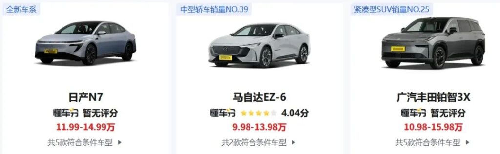 甚至还有合资品牌也来凑热闹,广汽丰田铂智3X售价10.98-15.98万元,东风日产N7售价11.99-14.99万元,长安马自达EZ-6优惠后将至9.98-13.98万元。看看这些车型的价格,要比不少自主品牌新能源车型的价格还低。