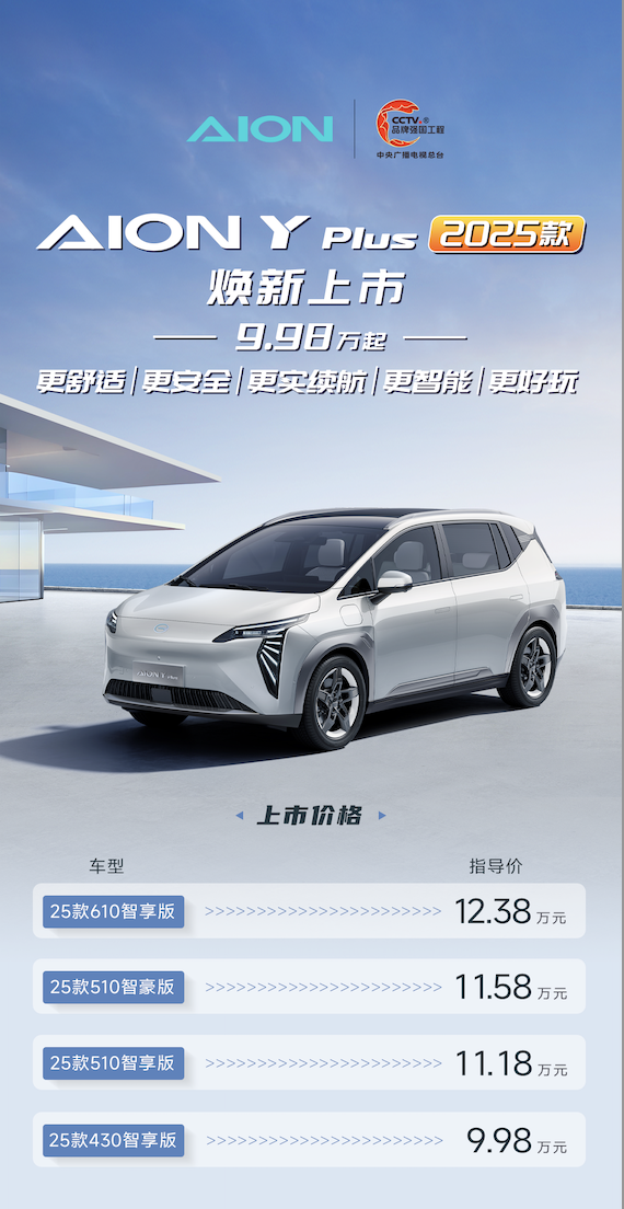 1月份罗永浩直播间,AION Y Plus用全是第一的成绩让老罗直呼讨厌:“全是第一,没有第二”,这次罗永浩在“交个朋友直播间” 首发2025款AION Y Plus,新车带来5大王炸升级,官方指导价9.98万元起。