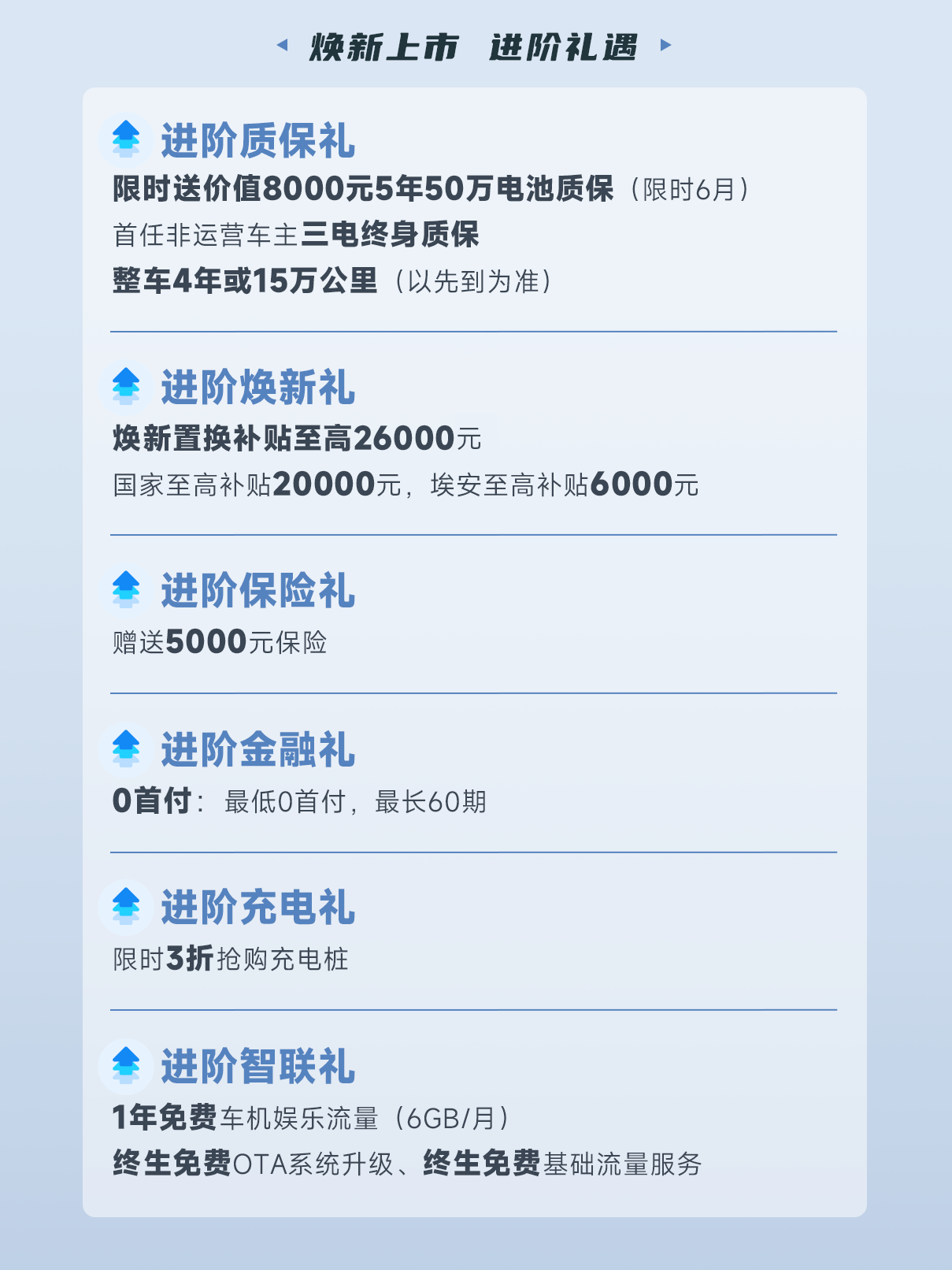 2025款AION Y Plus还提供了超值六重礼:至高26,000元焕新置换补贴(含国家补贴)、价值5,000元保险礼包、0首付提车、三电终身质保(首任非运营车主)或电池5年50万公里质保(限时6月)、限时3折抢购充电桩以及1年免费车机娱乐流量(6GB/月)等,主打一个让用户少花钱、多享受、更省心!