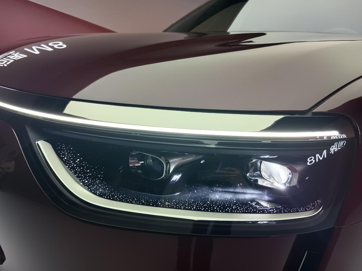问界M8的前脸灵动简约,车灯不再分为上下两部分,而是只保留了下半部分,搭配抬高的车头,傲然昂首的自信感喷薄而出。天境寰宇一体式前大灯配备百万级像素,历经200次打磨,内嵌缤纷碎钻,车灯点亮后,错落的碎钻反射出闪亮光芒,搭配适度景深,一眼望去犹如注视星河,感受到万镜灯华而融如一镜的大美之感,尽显问界M8的内敛深邃。