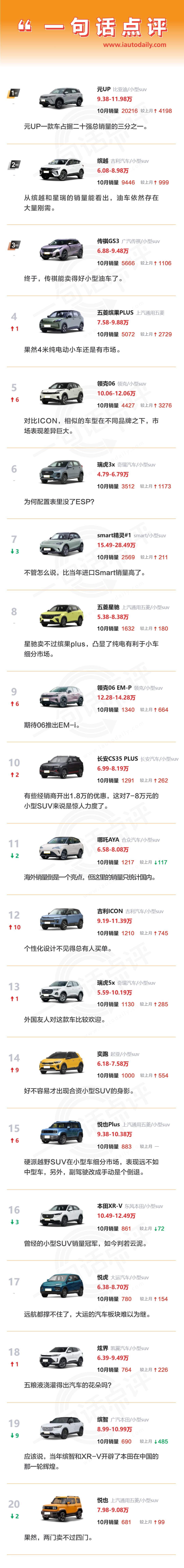 10月份小型SUV销量五强里,比亚迪元UP以20,216辆一骑绝尘,占了二十强总销量的近三分之一;吉利缤越也很优秀,9,446辆贴近五位数俱乐部;而传祺GS3终于用5,666辆的成绩证明传祺能卖好小车;五菱缤果PLUS的5,072辆成为“五千大关”的门槛;领克06的4,427辆如果加上EM-P,应该也超过五千。