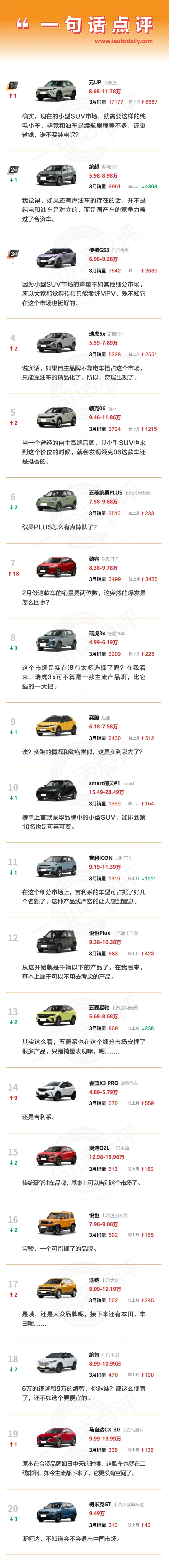 纵观整个榜单,基本上就是国产车的天下了。其中比亚迪元UP作为第一名遥遥领先,几乎是第二名销量的一倍。但是呢,这个市场又不缺少纯电小型SUV。这说明啥?说明这个市场的容量已经很小了。