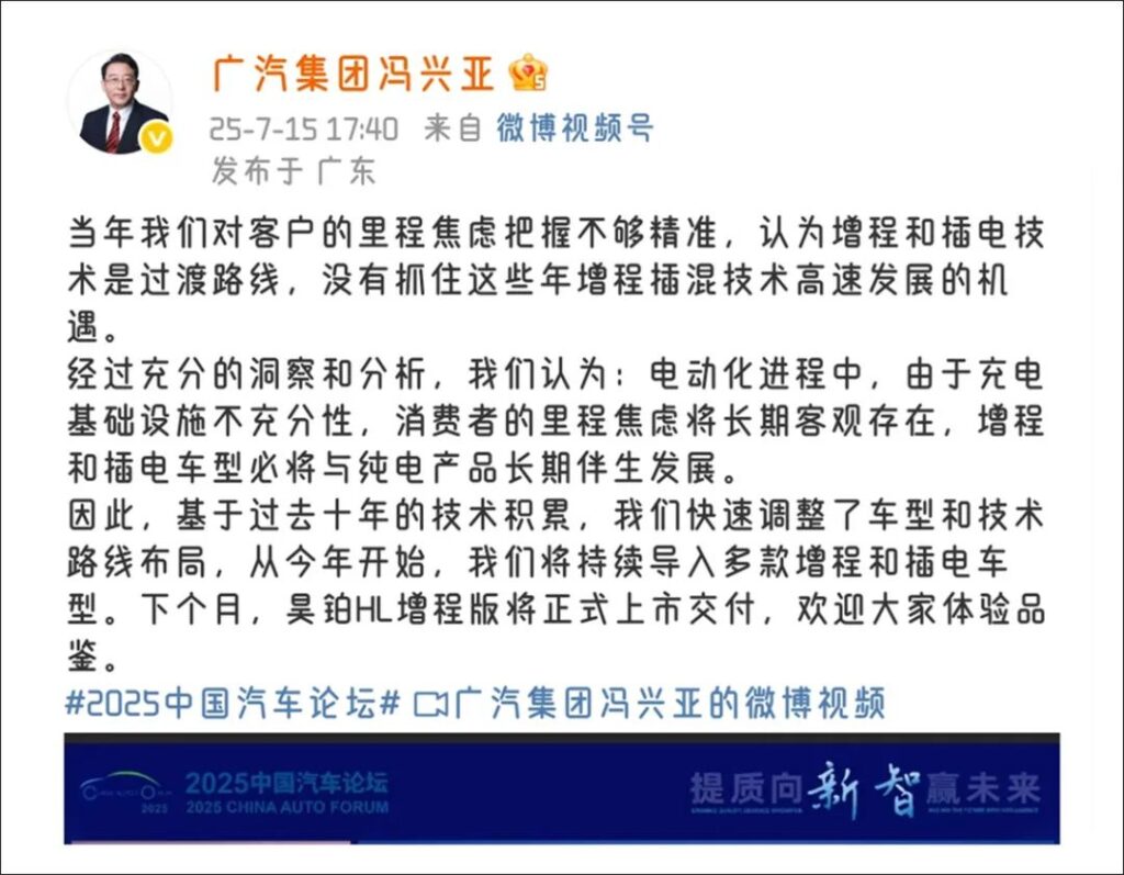 7月15日,冯兴亚再度在社交平台重提,反思了公司在新能源汽车领域的战略布局,直言过去对客户里程焦虑把握不准,未重视增程和插电技术,错失了发展机遇。