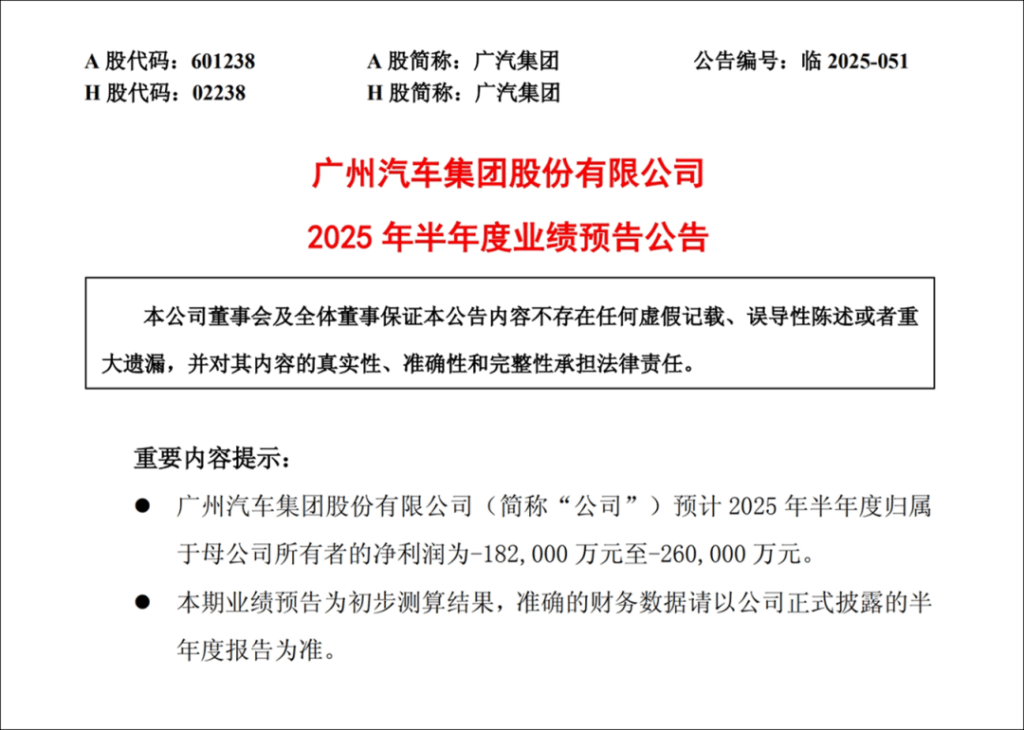 在集团新一轮的公告披露中,外界一度对广汽现阶段的收益很是紧张。“2025年上半年归母净亏损18.2亿元-26亿元”的预计收益,俨然将广汽的经营现状摆上了台面。