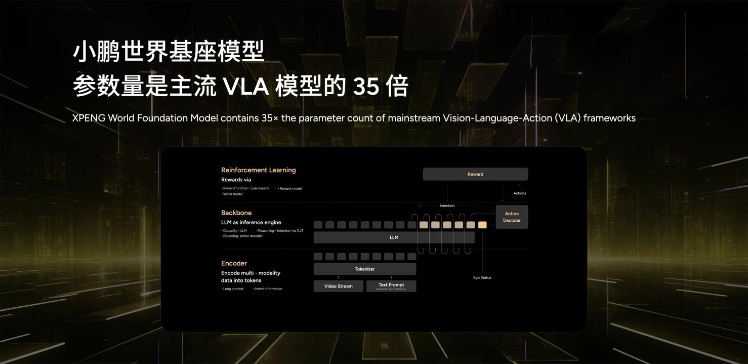 何小鹏表示,小鹏汽车正在研发一款720亿参数的超大规模自动驾驶大模型,也即“小鹏世界基座模型”。该模型的参数量是主流 VLA 模型的35 倍左右,具备链式推理能力(CoT),其在充分理解现实世界的基础上,能够像人类一样进行复杂的常识推理。未来经由基座模型的赋能,AI智能辅助驾驶系统有望从“模仿人类”向“超越人类”进化。而小鹏世界基座模型也将全面赋能小鹏AI体系全图谱,可同时用于小鹏汽车的AI汽车、AI机器人、飞行汽车上。