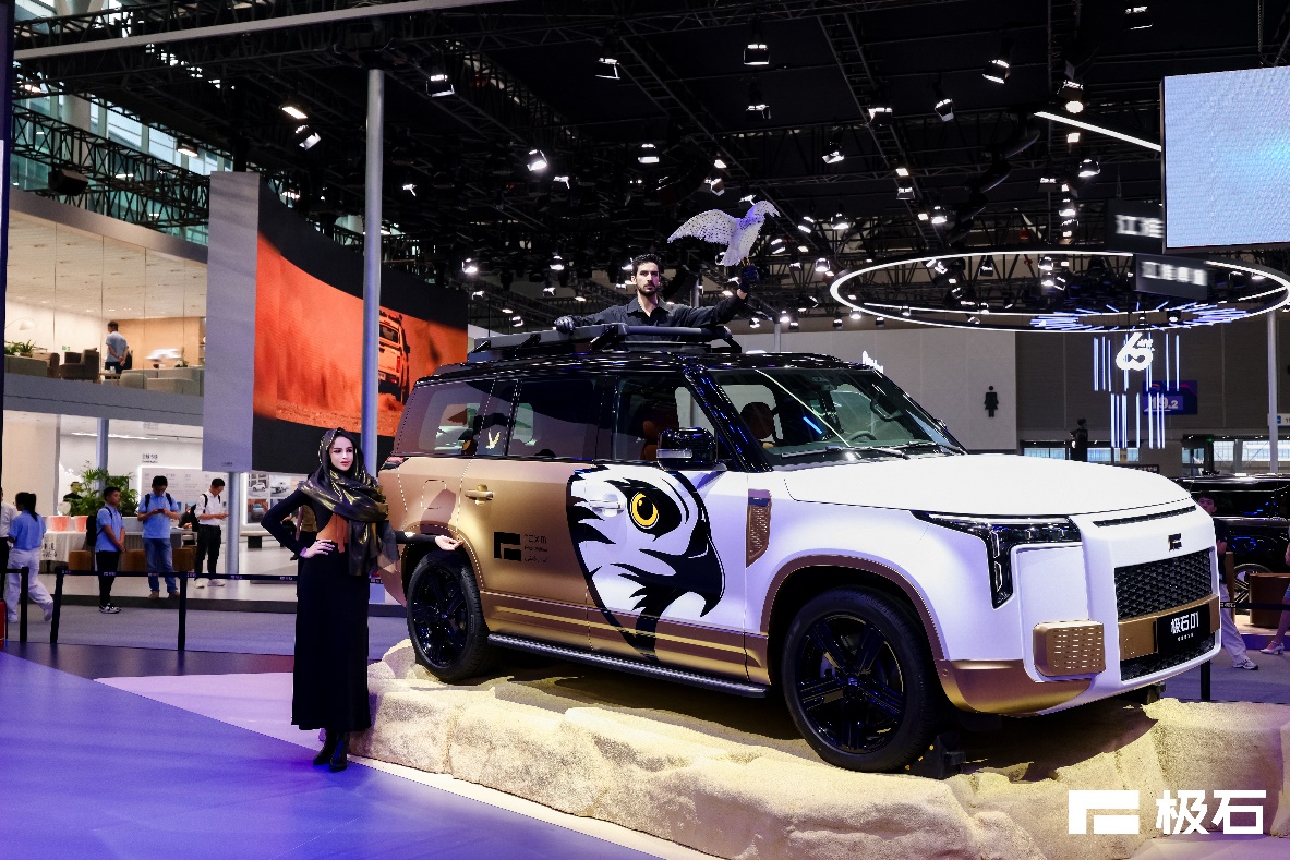 从传统的产品单向“走出去”,到产品共创、生态协同的双向“走上去”,极石汽车的全球化战略,始终扎根于当地的用车场景,聚焦于真实的用户需求。带鹰狩猎是阿拉伯最具代表性的文化遗产之一,极石汽车团队多次走访调研当地猎鹰市场、俱乐部,围绕猎鹰场景下的用车需求量身定制极石01猎鹰版。在阿布扎比国际狩猎和马术展览会(ADIHEX)上,极石01猎鹰版展车以百万高价被当地王室收入囊中。在广州车展上,极石01猎鹰版正式完成国内首秀,将阿拉伯传统文化与生活方式的独特魅力带到观众身边。