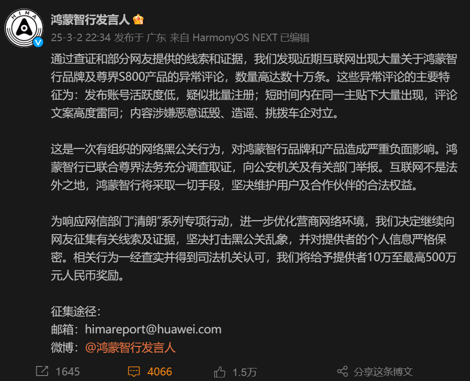 “经查,2024年5月以来,某公司操纵数十家MCN机构使用上万个账号发布、评论大量恶意造谣、抹黑、诋毁鸿蒙智行品牌及产品的虚假信息,严重误导社会公众,损害鸿蒙智行品牌和产品声誉。近日,从司法机关了解到,该公司多人已被公安机关缉拿归案并被检察院依法批准逮捕。”