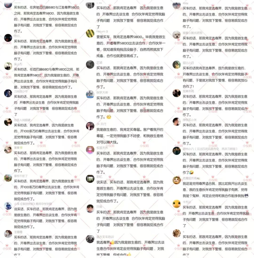 有人谩骂、有人诅咒,从江淮汽车到鸿蒙智行,乃至于华为公司。总而言之,一边倒的流量猛攻。所有近期发出的,只要是涉及尊界S800、华为等关键词的微博、推送,通常都是一堆新注册或者日常活动量很低的账号,扎堆在一起“团建”,刷着非常相似的话术……
