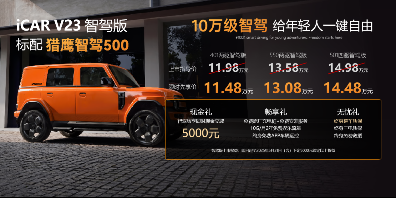 作为iCAR品牌升维的全新力作,V23智驾版不仅延续了独树一帜的设计风格,更在驾驶体验、智能科技等方面带来全面革新,新车共推出401两驱智驾版、550两驱智驾版和501四驱智驾版三款车型,指导价分别为11.98万元、13.58万元和14.98万元。新车不仅提供了限时5000元现金优惠,还带来了丰富的购车权益,包括免费原厂充电桩、终身整车质保、终身三电质保等,进一步提升了性价比。作为一款纯电动紧凑型SUV,iCAR V23智驾版凭借其高阶智能驾驶系统、硬派设计风格以及丰富的个性化配置,成为年轻消费者关注的焦点。