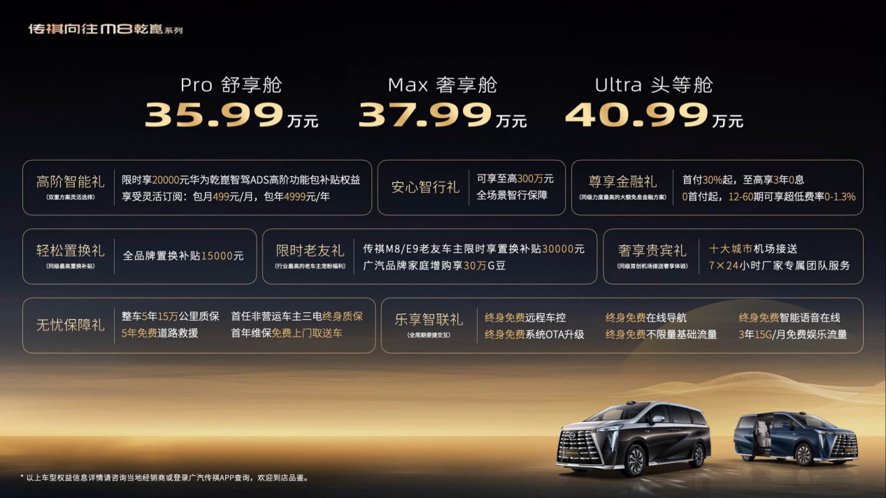 卷福利方面,针对最新上市的向往M8乾崑,传祺准备了满满当当的夏日豪礼。不仅有同级力度最强的尊享金融礼,提供0首付和0利息两种方案;还有行业首破1.5万元的轻松置换礼,全品牌置换补贴立享1.5万元。此外,对于已经传祺M8、E9老车主,置换M8乾崑补贴再翻倍,给予高达3万元的专属福利。