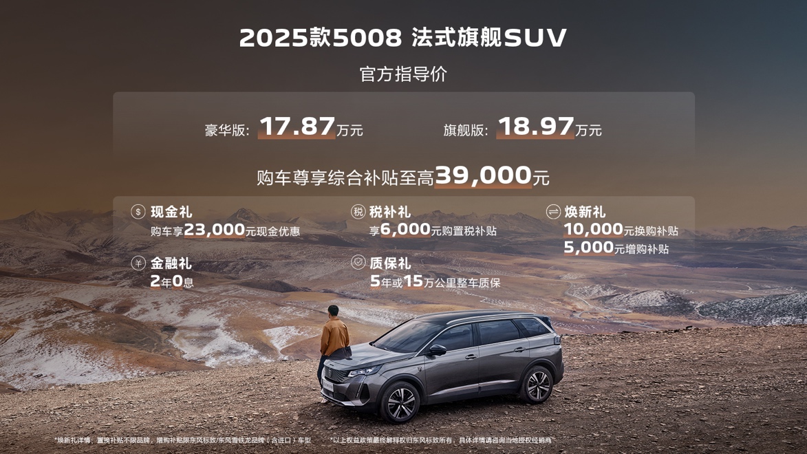 售价方面,东风标致2025款5008官方指导价为17.87-18.97万元,购车综合补贴至高39000元,以5座价格尊享7座体验,并提供现金礼、税补礼、焕新礼、金融礼、质保礼5大超值购车权益: