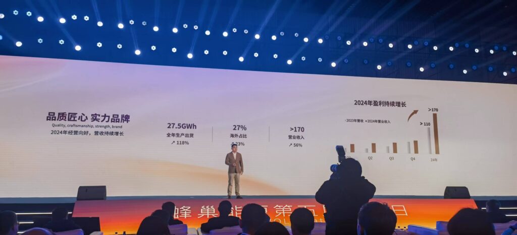 另外几个核心数据,也同样可圈可点。2024年,蜂巢全年生产出货量为27.5Gwh,同比增长118%;相同赛道的海外市场占比,过去一年高达27%,同比增加了23%;而在营业收入上,全财年更是提升了56%。