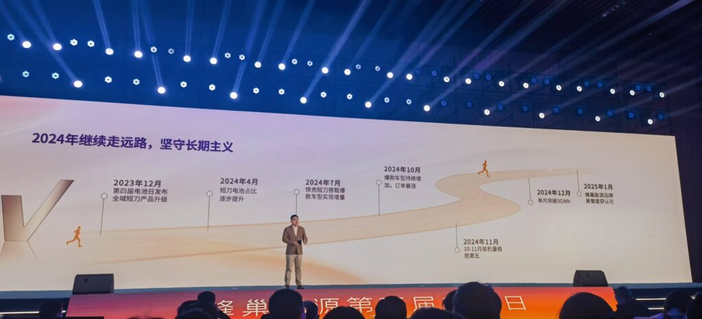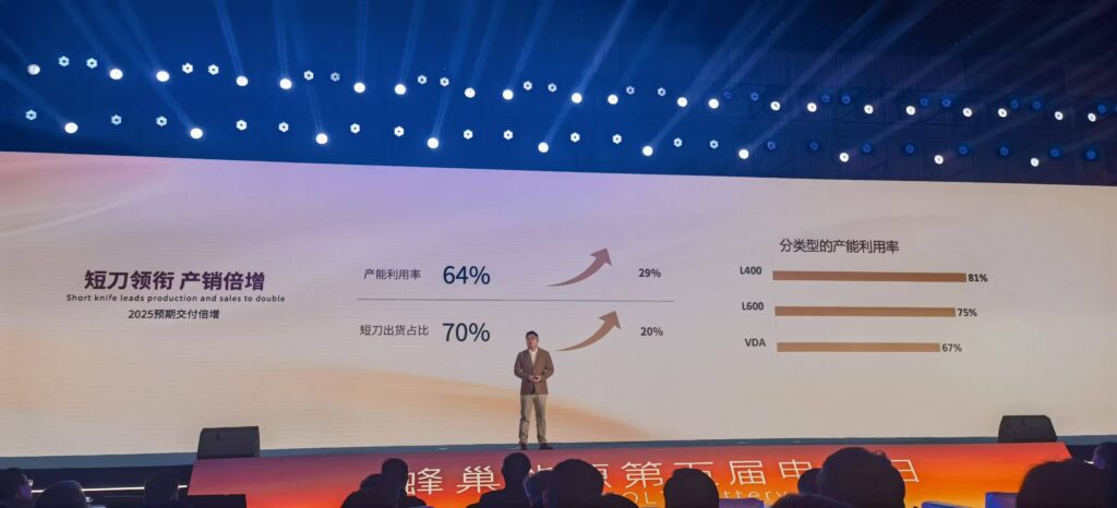 而在业界较为关注的短刀电池方面,公司在电池产出效率上也有较大提升,过去的2024年,蜂巢短刀总出货量达到9.61Gwh,占全球短刀电池出货量比例高达35%。