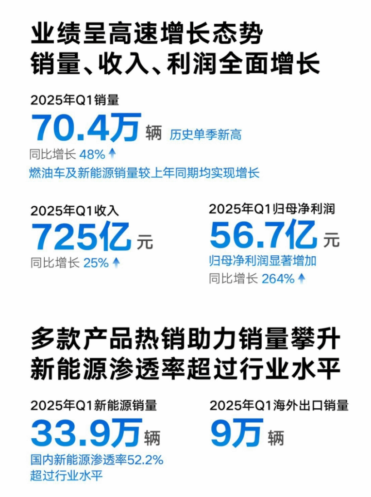 5月15日,吉利汽车(0175.HK)发布2025年第一季度财报。该季度吉利汽车实现营业收入725亿,同比增长25%。归母净利润56.7亿,达到曾经一年的利润水平,同比增长264%。毛利率保持稳健,期内实现毛利人民币114.37亿元,盈利能力显著提升。