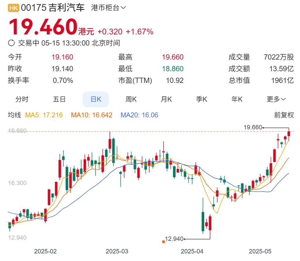 吉利在香港上市的股票今年上涨了32%,超出了基准的恒生指数18%的涨幅。近一个月以来,吉利港股股票从最低12.9港元上涨到了19.6港元,大涨超50%。