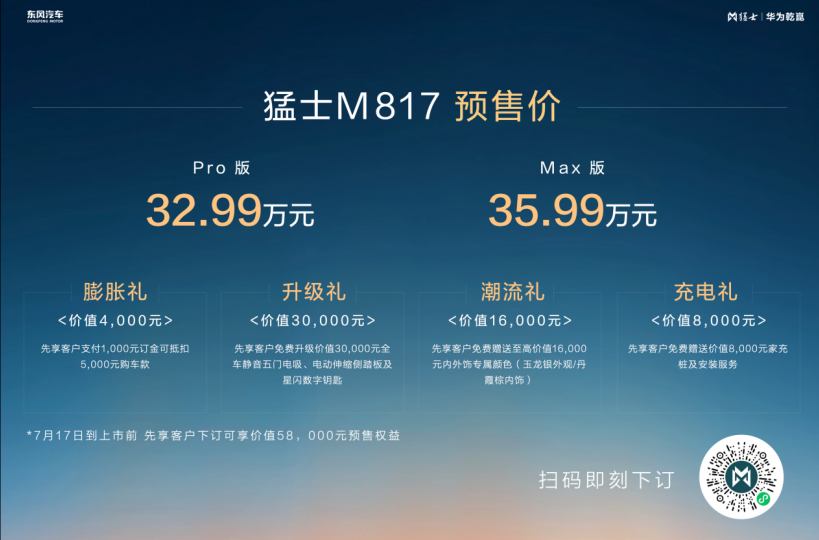当新能源浪潮重塑汽车产业,硬派越野市场正迎来“机械硬核”向“智能全域”的关键转折。7月17日,“铁血猛士”与“满血华为”强强联合打造的“豪华智能越野 SUV”——猛士M817正式预售,其中猛士M817 Pro版预售价32.99万元,猛士M817 Max版预售价35.99万元,即日起下订可享价值58,000元限时预售权益。