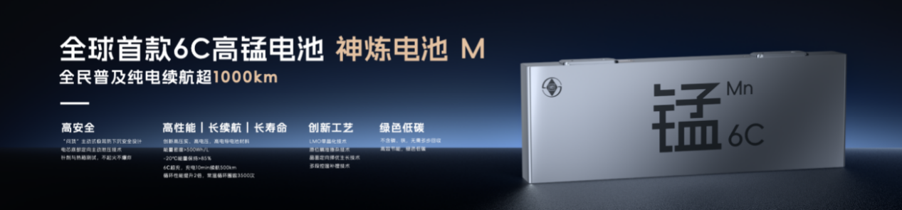 面向未来,神炼电池4.0也进化登场,将采用800V平台、CTB、智能无线BMS和AI能量管理等多项技术,并通过全新智能温控技术、3D多面立体热管理和热电分离技术实现安全再升级。同时,全球首款6C高锰电池——神炼电池M也将全面加持神炼电池4.0,7分钟即可补能50%,结合独创的问顶高安全极耳设计和创新体系复配技术,进一步提升电池在安全、性能、续航和寿命方面的综合表现,全力助推纯电续航超1000公里的全民普及。