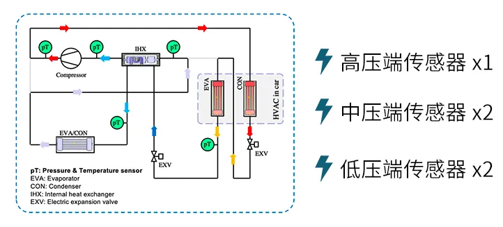 一套典型的二氧化碳热泵系统中,会使用5只温度压力传感器,通常为1只高压端传感器,2只中压端传感器和2只低压端传感器。它们分布在热泵系统中不同的位置,采集热泵系统的温度和压力信息,用来控制和调节热泵系统,以达到最佳的使用效果和最低的能耗。