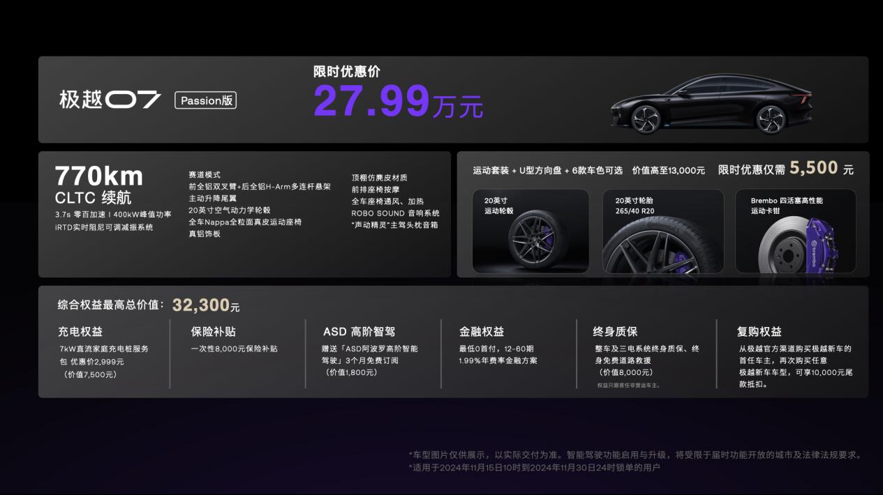 如果说,极越ROBO X是年轻人对智能汽车的终极梦想,那么极越发布的另一款新车则是让梦想变得更加触手可及。在本届车展上,极越07 Passion版也公布了27.99万元的限时优惠价,放眼同级如此一台具备赛道属性的智能纯电轿车,极具竞争力。这也是让年轻人提前体验ROBO X所代表的“Passion”!